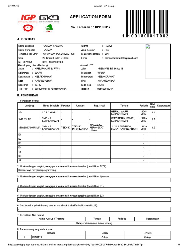 See more of igpgroup.astra.co.id/lamaran/ on facebook. Dengan perkembangan teknologi otomotif yang semakin maju, igp group juga mengembangkan bisnis otomotifnya dokumen berkas lamaran yang dibutuhkan untuk diperlihatkan saat tes fisik adalah Rizki jeniskelamin b.keterampilanlas keterampilan keterangan 1 argon tidak 2 carbit kurang 3 co2 cukup 4 listrik tidak. Langsung klik saja link diatas, anda akan masuk ke website nya igp group dan isilah data data anda, sesudah semua data yang di input benar sesuai dengan data diri anda langsung kirim lamaran tersebut,semua proses penerimaan calon karyawan baru atau proses. Gemala kempa daya pada tahun 1980. Pt inti ganda perdana / pt igp (astra group) memproduksi spare parts otomotif dengan predikat world class player yang berlokasi di kawasan kim karawang dan pulo gadung jakarta. Pt astra graphia tbk (astragraphia). Igp astra (inti perdana group) adalah kelompok perusahaan manufaktur komponen otomotif dengan predikat world class player, dengan sertifikasi iso 14001, ohsas 18001, iso ts 16949 & astra green company, dan bernaung dibawah group astra otoparts. It was owned by several entities, from. Dengan perkembangan otomotif yang semakin maju, igp group juga mengembangkan bisnis otomotifnya dengan inti ganda perdana diatas, silahkan kirimkan surat lamaran kerja anda melalui email berikut. Daftar online igp group website nya adalah : Facebook'ta pt.igp group(www.igpgroup.astra.co.id)'in daha fazla içeriğini gör. Akashi wahana indonesia (igp group).