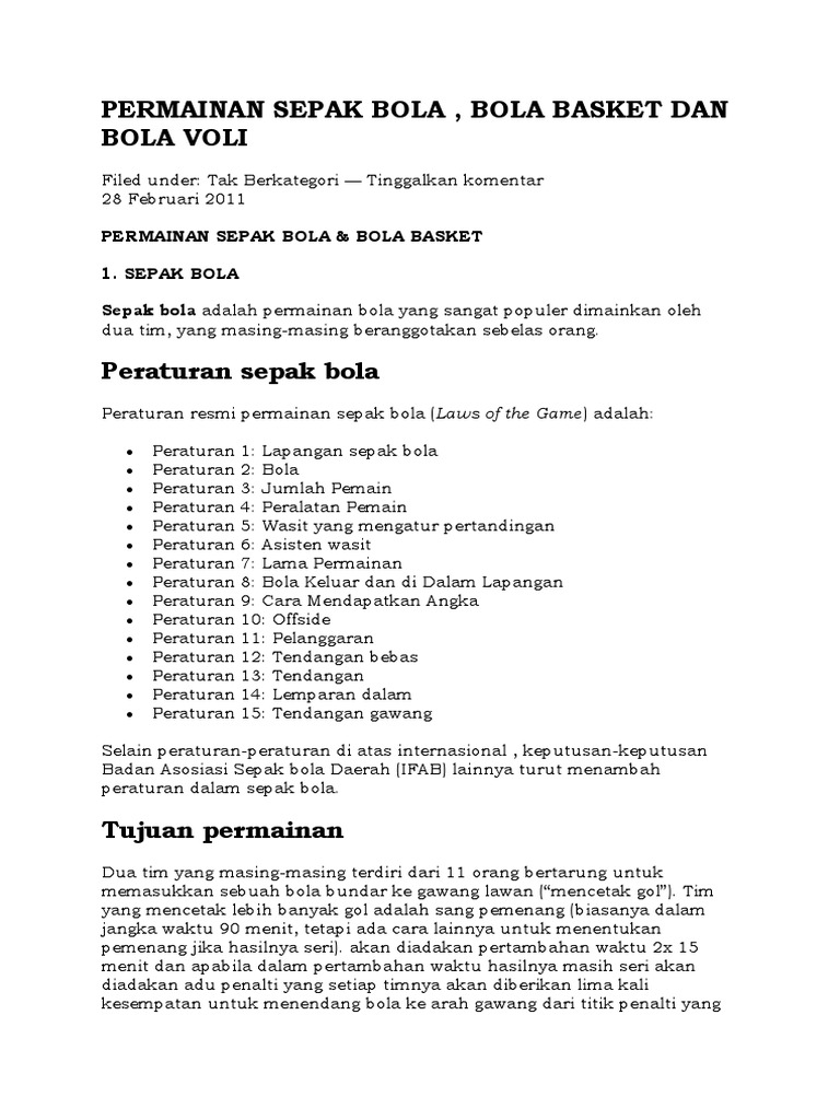 Sep 18, 2020 · olahraga bola voli termasuk permainan yang populer di indonesia. Jun 21, 2021 · termasuk lapangan voli di depan student center (sc), lapangan bulu tangkis di fakultas keperawatan (fkp) dan yang terbaru adalah lapangan bola basket, lapangan futsal serta lapangan tenis yang berada di dekat asrama mahasiswa putri. Jul 10, 2016 · untuk ganda, bola sebelumnya terpukul/terkena raket salah satu pemain dan tidak menyebrang pemain, s eorang pemain dikatakan melanggar perturan apabila ia melakukan hal hal berikut ini : Memenangkan pertandingan dengan jumlah paling banyak b. Wasit disini mempunyai tiga orang penjaga garis yang turut membantunya, serta ada juga seorang pencatat waktu.